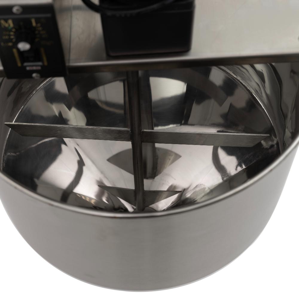 - Встроенная система перемешивания. Месильный орган с отдельным приводом постоянно перемешивает продукт в бункере, предотвращая образование комков, осадка и расслоение, что особенно важно для вязких и нестабильных составов.