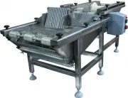 Предназначена для глазирования в льезоне и автоматической обсыпки панировочными сухарями полуфабрикатов из мясного, рыбного или овощного фарша. Для перемещения полуфабрикатов в ванне с льезоном и в коробе с панировочными сухарями установлены транспортеры с лентой из пищевой нержавеющей стали. С целью автоматизации технологического процесса ванна с льезоном конструктивно установлена на едином каркасе перед коробом с панировочными сухарями. Выходная часть имеющегося в глазировочной ванне ленточного транспортера размещена над транспортером, перемещающим полуфабрикат в коробе с сухарями. Таким образом, полуфабрикат, уложенный на транспортер ванны для глазирования, погружается лентой этого транспортера в льезон и после выхода из него падает на транспортер в коробе с сухарями. Над лентой этого транспортера установлен специальный накопитель, формирующий вал из панировочных сухарей, проходя сквозь который покрытый льезоном продукт панируется со всех сторон. Излишки панировочных сухарей осыпаются на дно короба для их повторного использования, а покрытый панировкой полуфабрикат снимается с транспортера вручную. Машина для панировки выполнена полностью из нержавеющей стали.